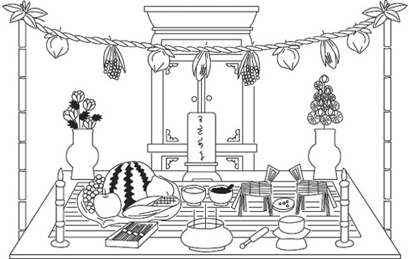 一例であげると、仏壇の前に京机(台、テーブル)を置いてまこも(ござのようなもの)を敷きその上に馬や牛の飾りや浄水・果物・野菜・菓子・そうめん・だんご・故人の好きだったものなどを供えます。